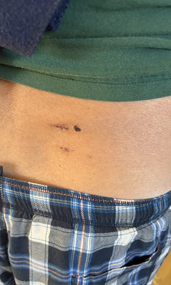 The wonders of modern medicine. Day five after most difficult spinal surgery next to the lump of nerves. The photo shows postoperative stitches on my back. Basically, two scratches and a stretched hole with a diameter of 5 mm. Through this hole, a neurosurgeon with the help of a dozen assistants released the blocked nerve, milling the bone from the vertebrae holes, thereby increasing the gap for the nerve. I mixed the bone shavings with my biomaterial, and with this composition I smeared the seam between the vertebrae that moved against each other. During the year, the vertebrae should fight, thus preventing further shifts.